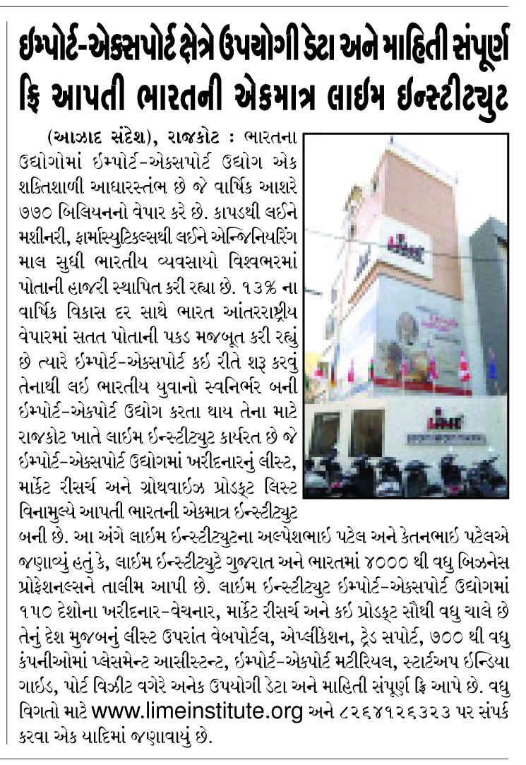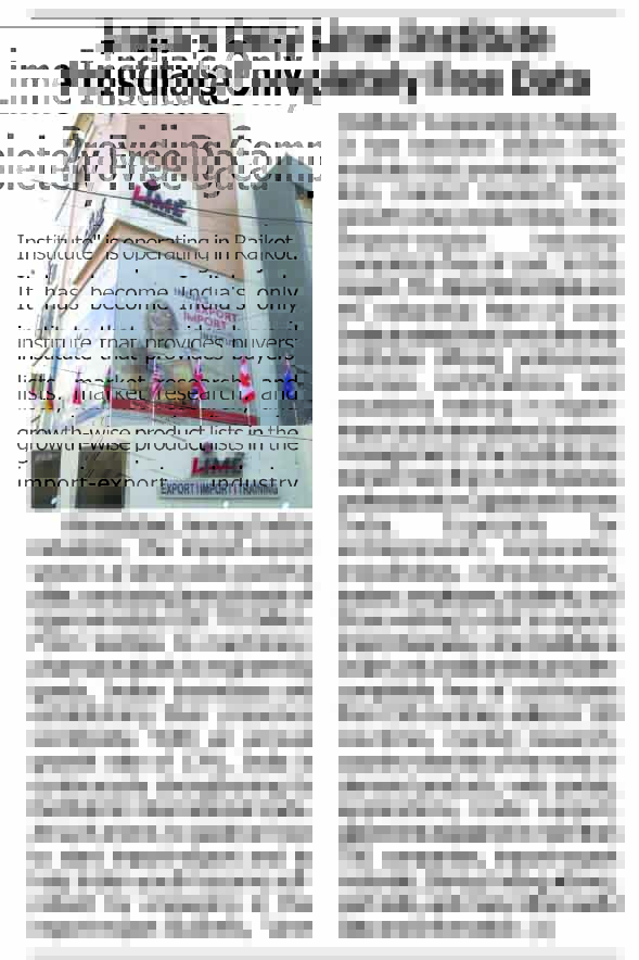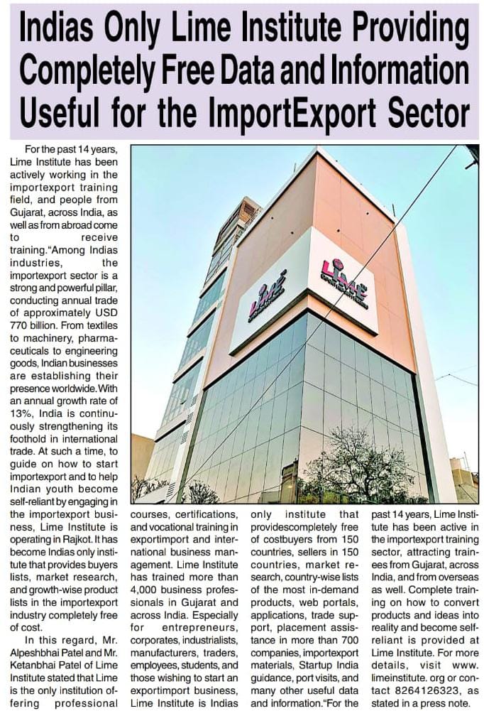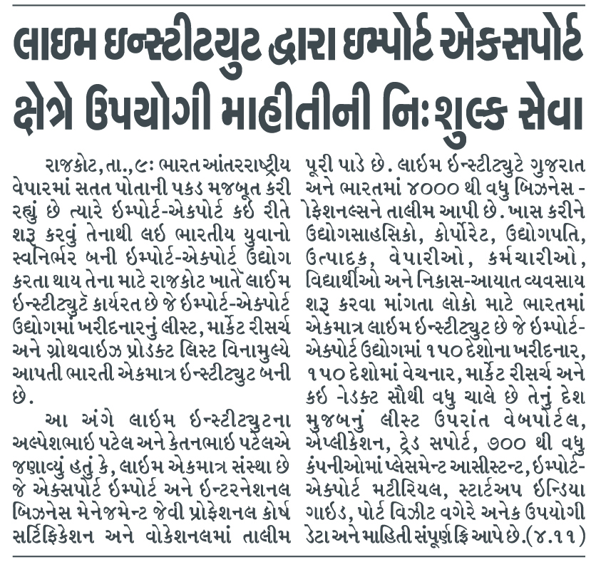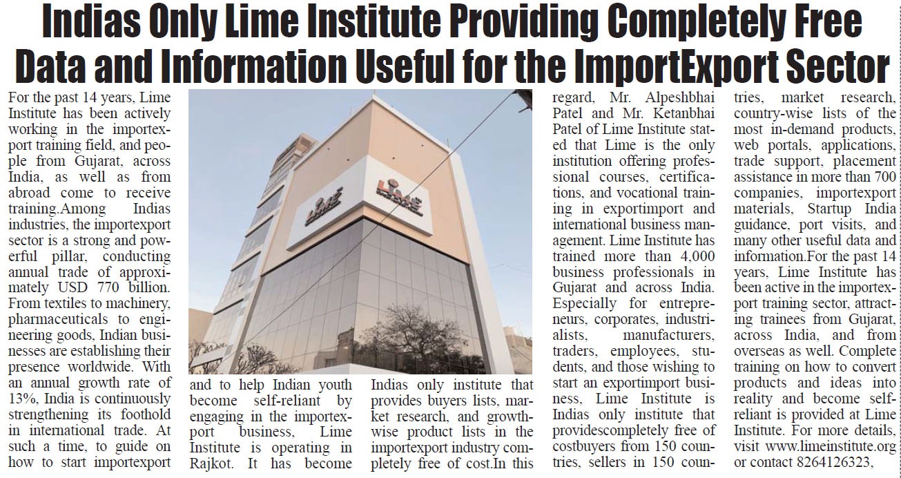 For the past 14 years, Lime Institute has been actively working in the import–export training field, and people from Gujarat, across India, as well as from abroad come to receive training.