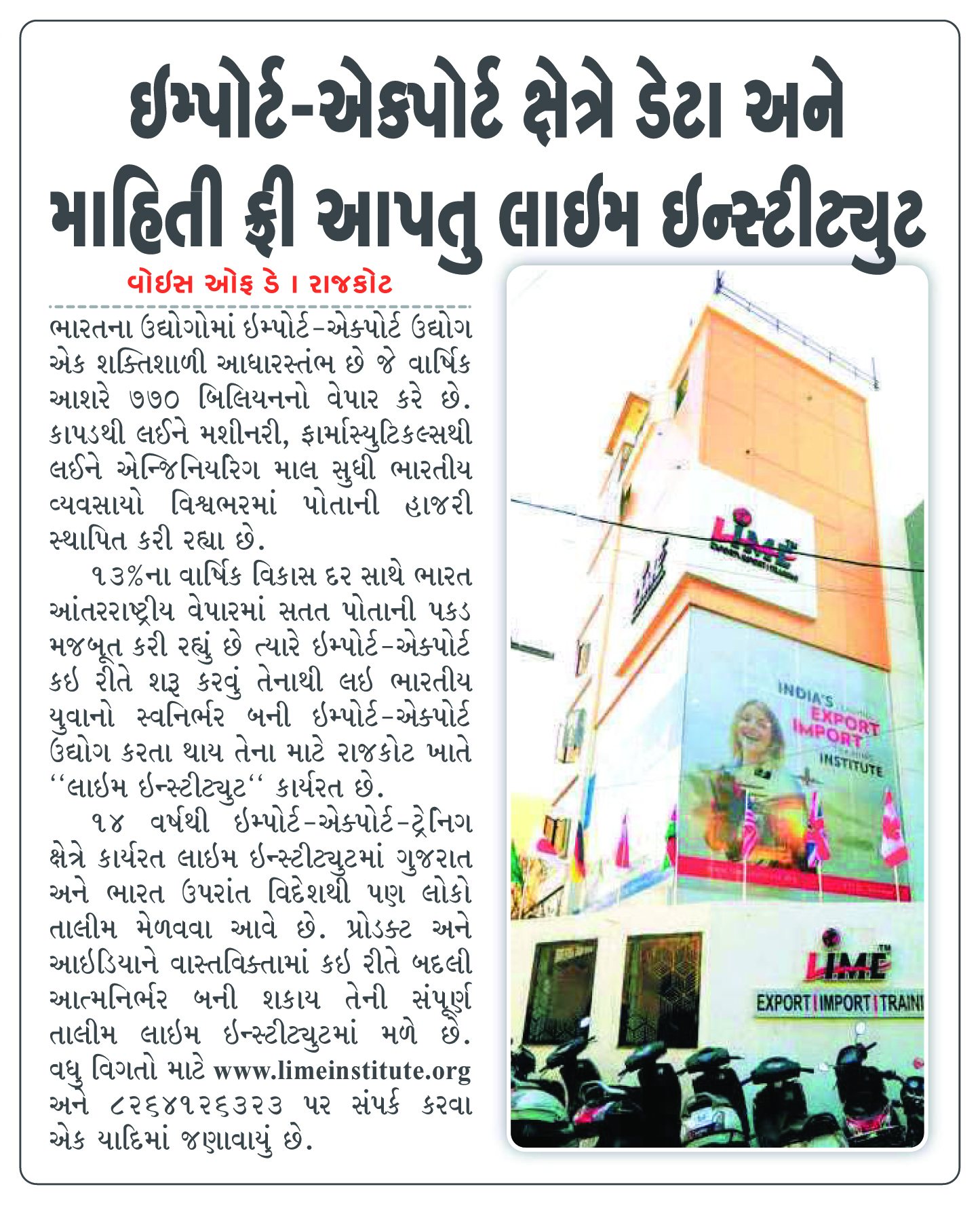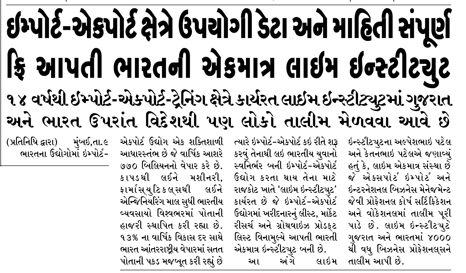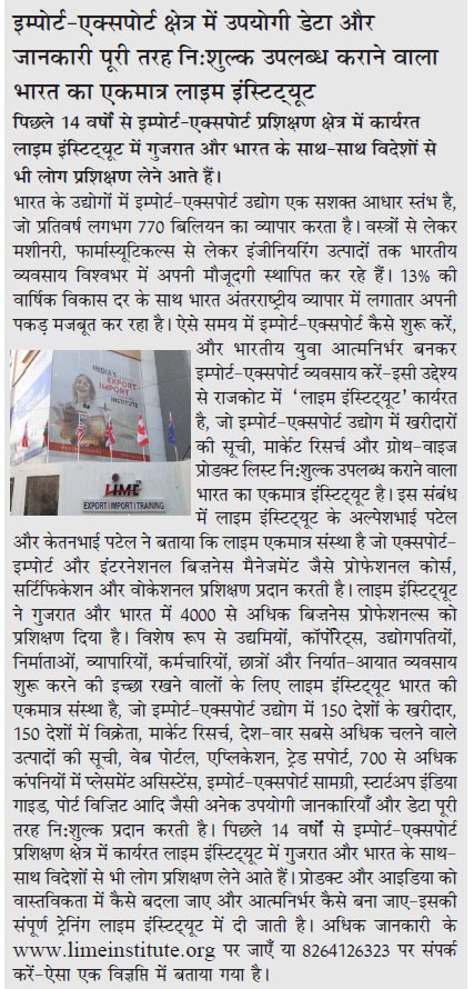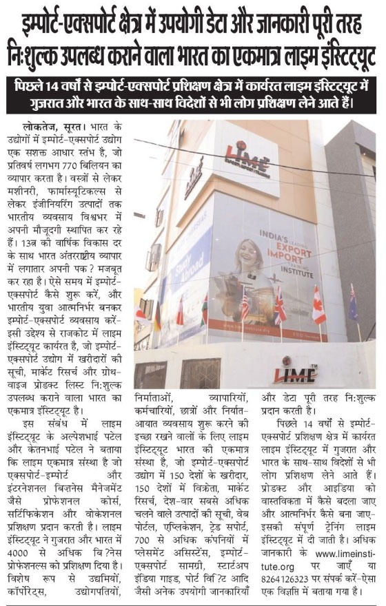 For the past 14 years, Lime Institute has been actively working in the import–export training field, and people from Gujarat, across India, as well as from abroad come to receive training.