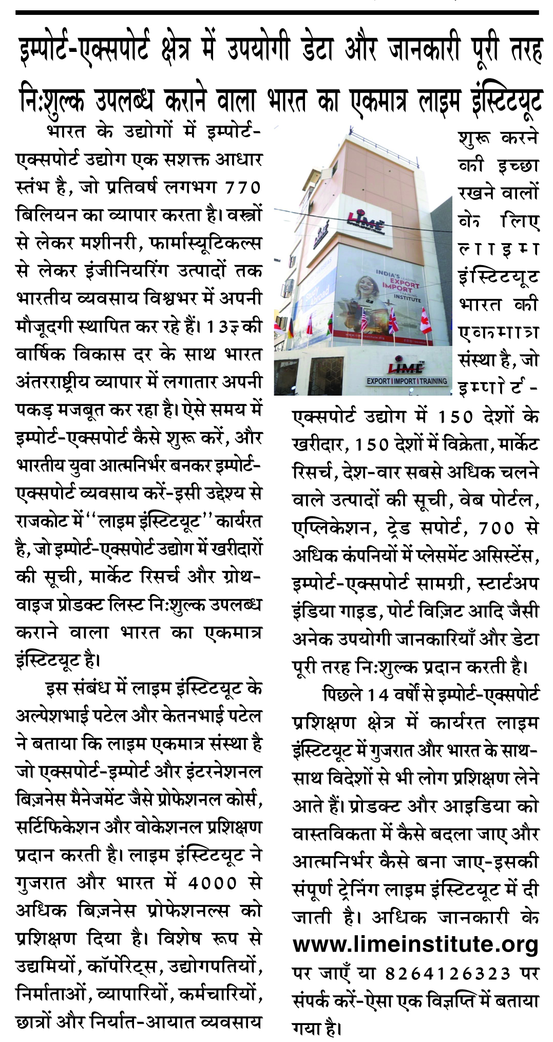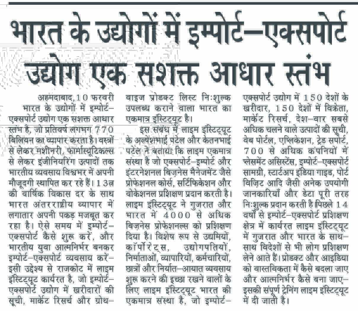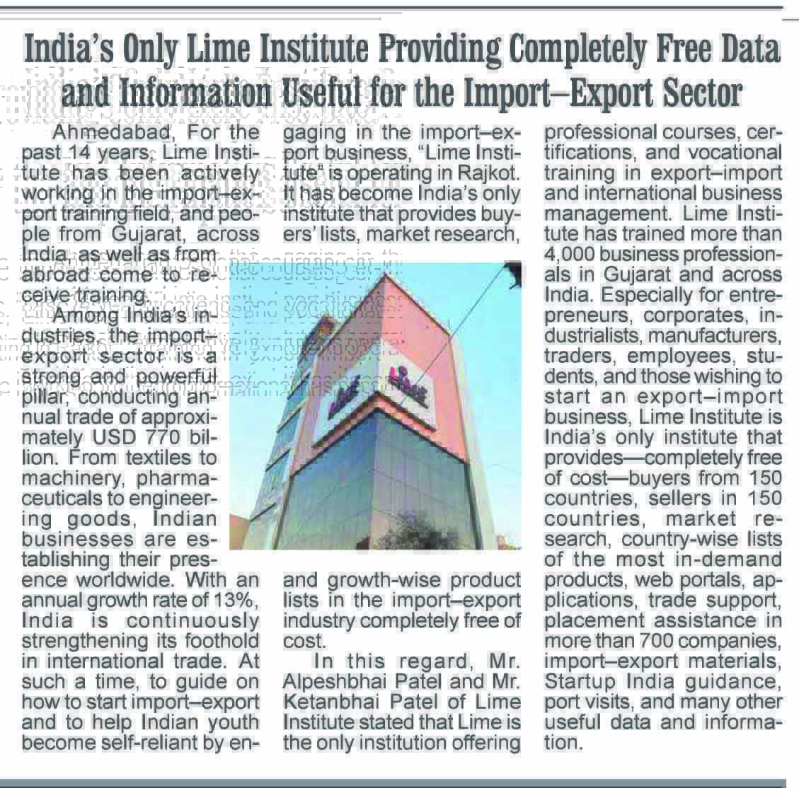 For the past 14 years, Lime Institute has been actively working in the import–export training field, and people from Gujarat, across India, as well as from abroad come to receive training.
